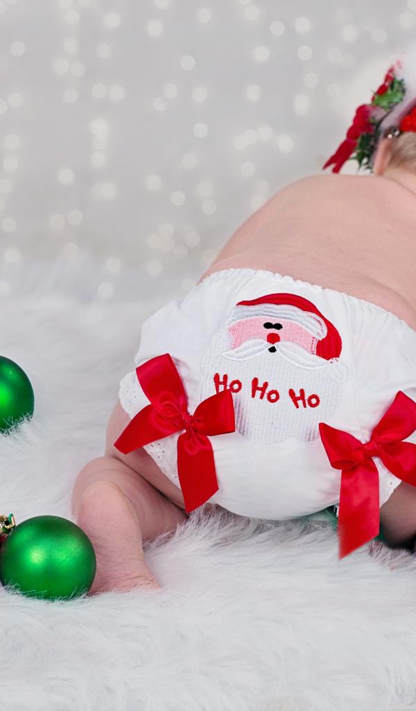 Wallpaper Little baby girl with Christmas toys on a white bedspread