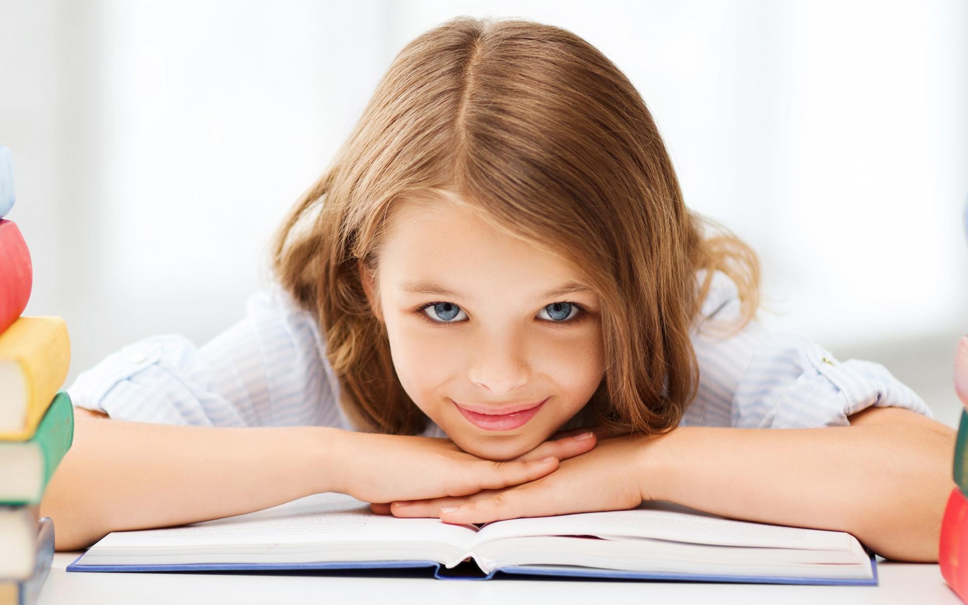 Wallpaper Little blue-eyed girl schoolgirl with a book