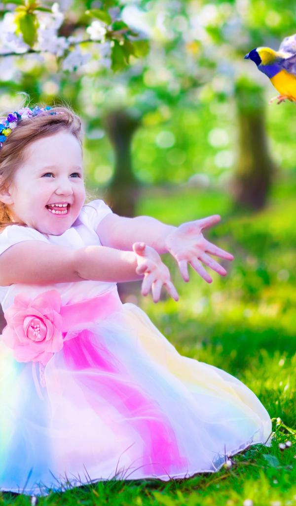 Wallpaper Laughing little girl in beautiful dress on green grass