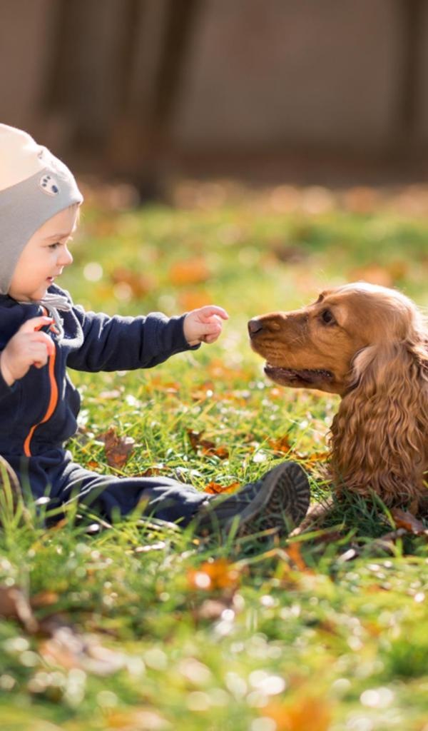 Wallpaper Little boy sitting on the grass with a dog