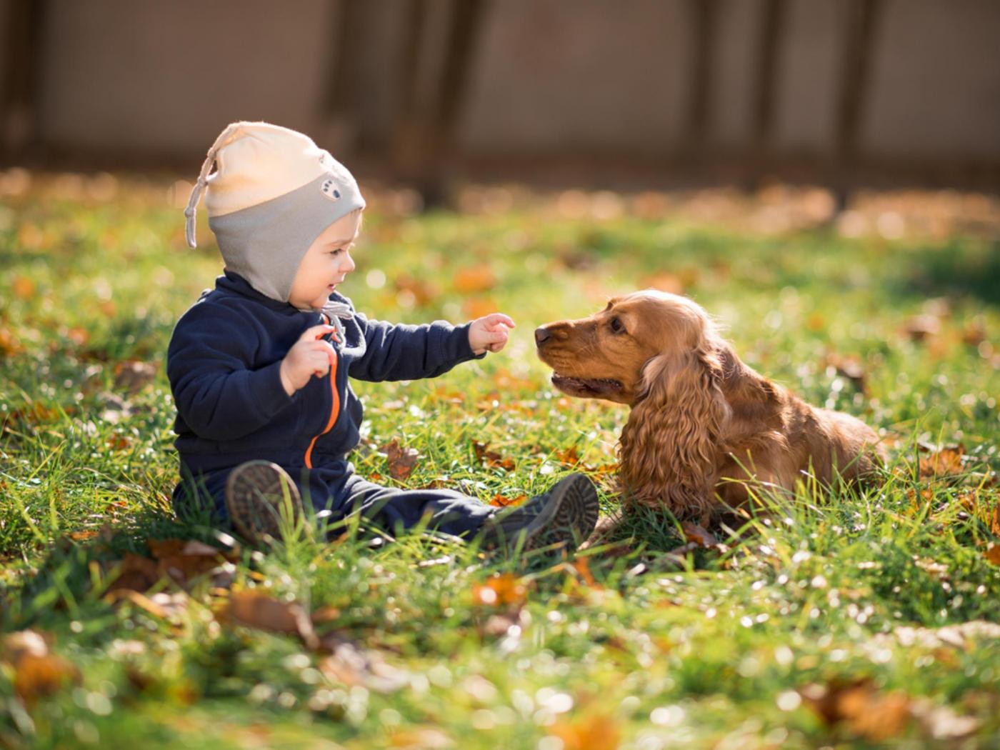 Wallpaper Little boy sitting on the grass with a dog