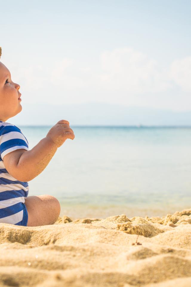 Wallpaper A small child is sitting on the sand on the beach by the sea