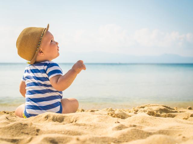 Wallpaper A small child is sitting on the sand on the beach by the sea