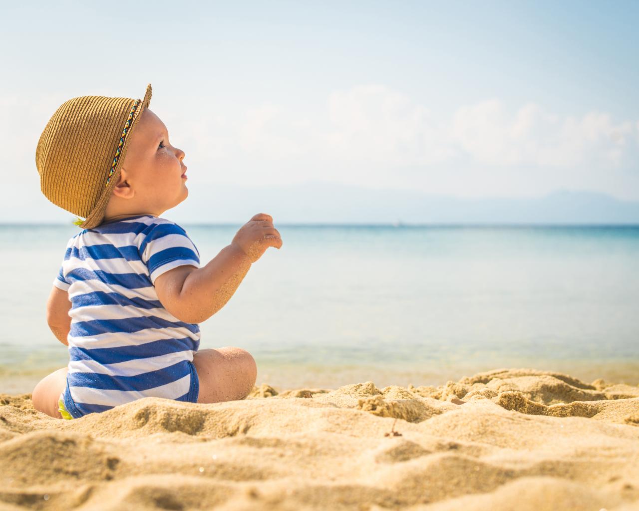 Wallpaper A small child is sitting on the sand on the beach by the sea