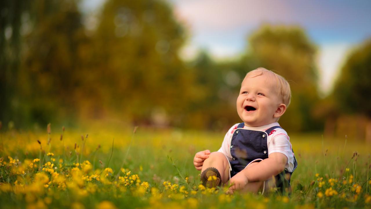 Wallpaper Little laughing boy sitting on the grass with yellow flowers