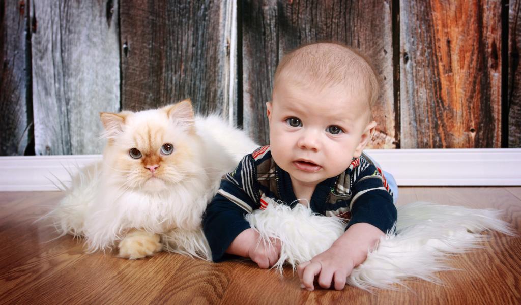 Wallpaper Little boy lying on the floor with a cat