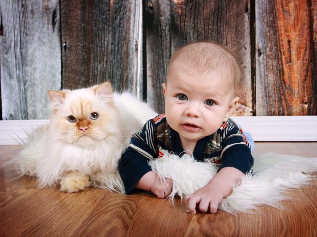 Wallpaper Little boy lying on the floor with a cat