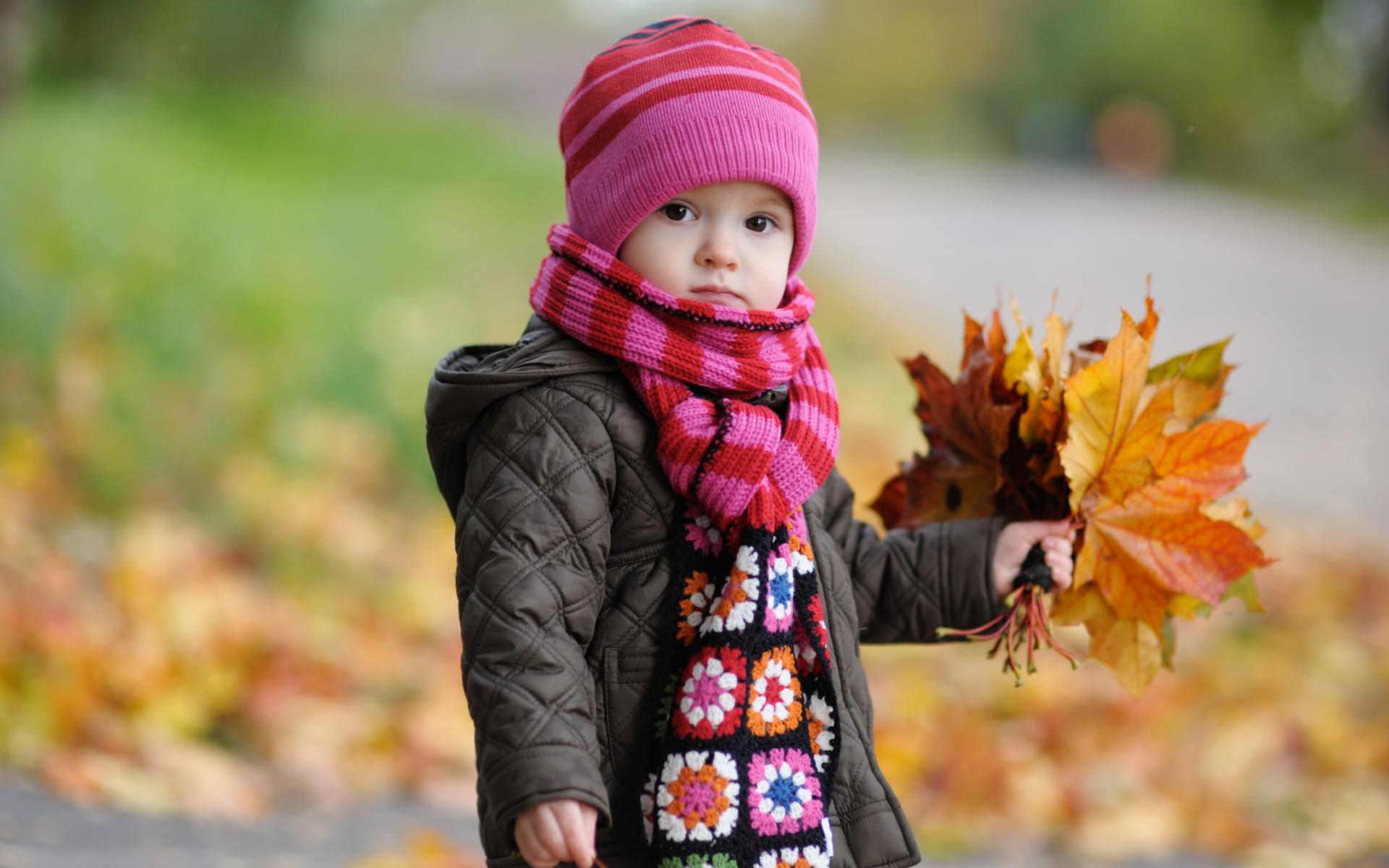 Wallpaper Little girl in a pink hat with leaves in hand
