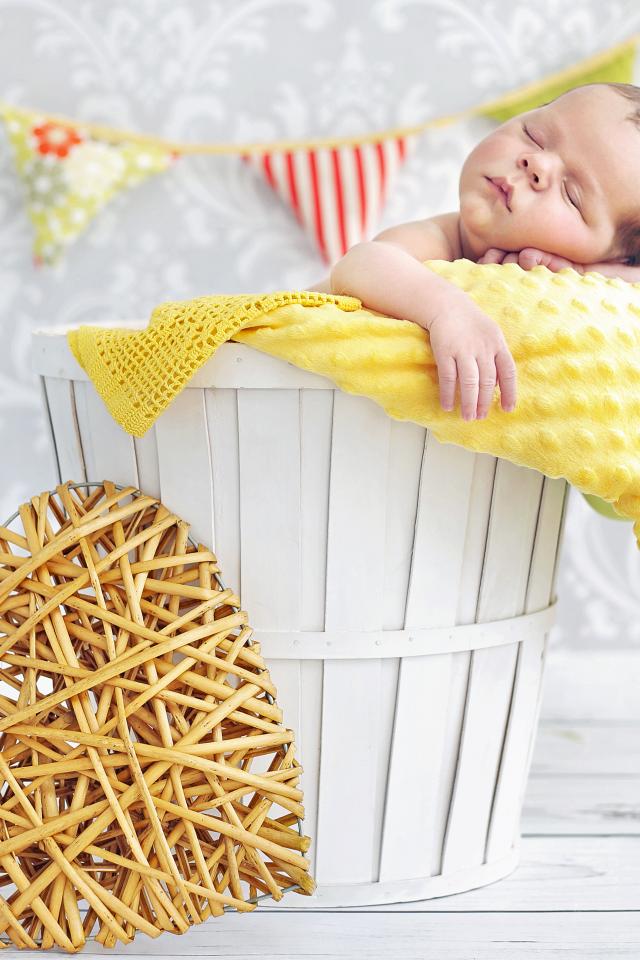 Wallpaper Little baby is sleeping in a basket with wicker heart.