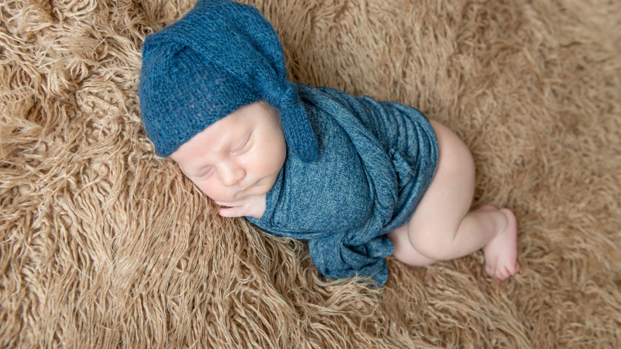 Wallpaper Little sleeping baby in a blue knitted hat on a fur blanket