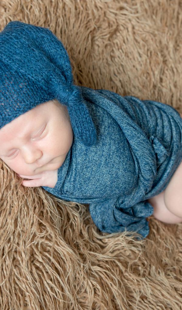 Wallpaper Little sleeping baby in a blue knitted hat on a fur blanket