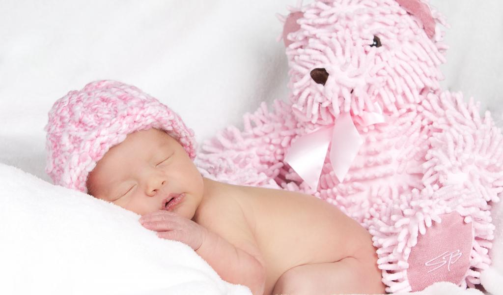 Wallpaper Little sleeping baby in a pink hat with a teddy bear