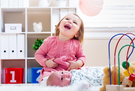 Wallpaper Laughing little girl in beautiful dress on green grass