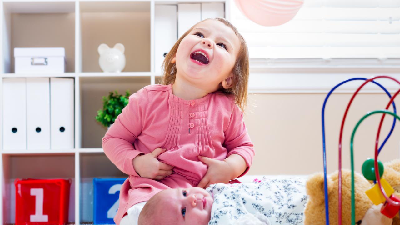 Wallpaper Laughing little girl with baby