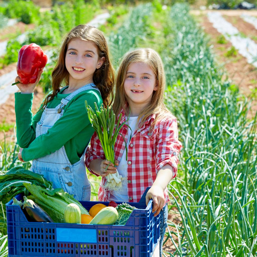 Wallpaper Two little girls gather vegetables in the garden