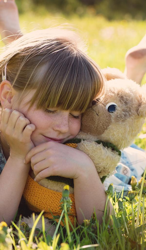 Wallpaper Girl with a toy in her hands lying on the grass