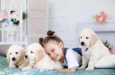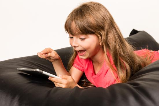 Wallpaper Little smiling girl lies with the tablet.