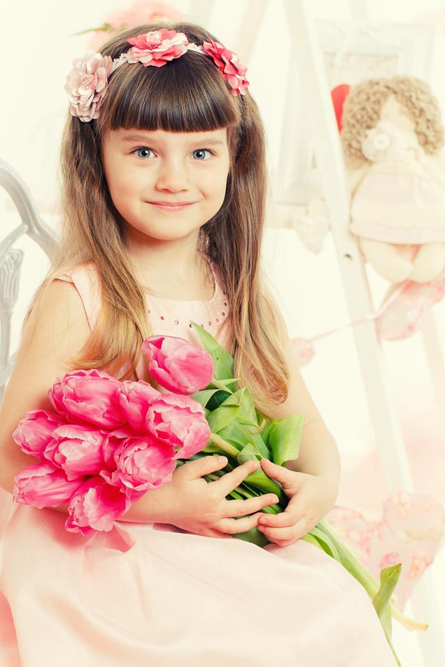 Wallpaper Beautiful cute blue-eyed girl with a bouquet of pink tulips