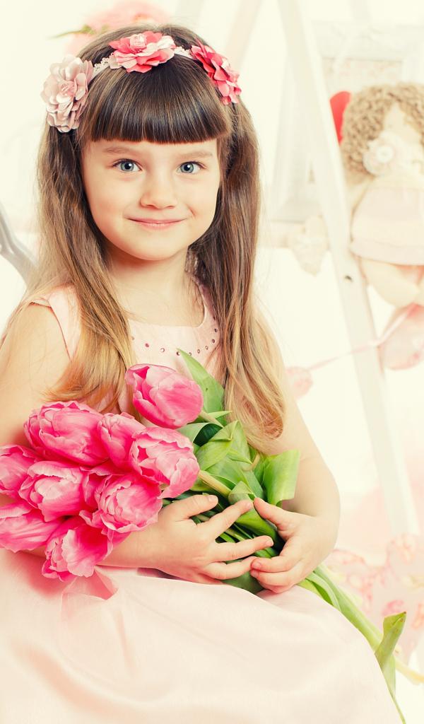 » Wallpaper Beautiful cute blue-eyed girl with a bouquet of pink tulips
