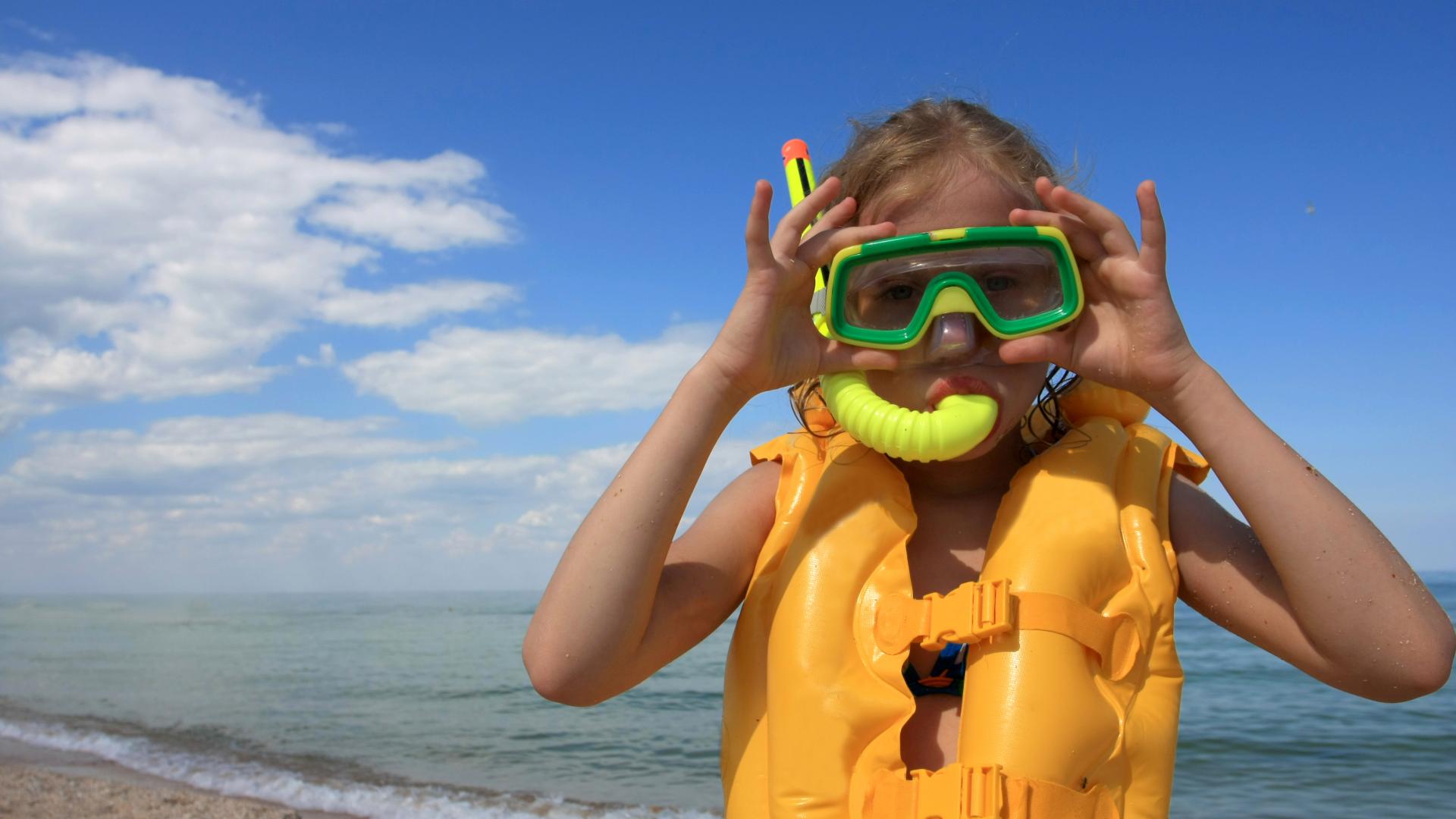 Wallpaper Little girl in a mask and a life jacket on the sea