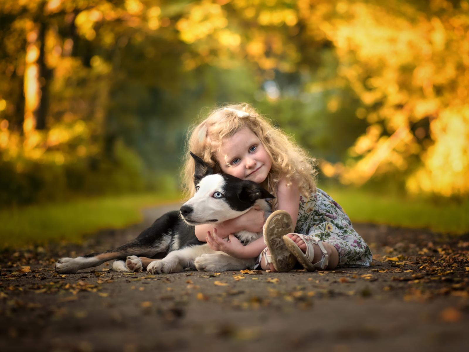 Wallpaper Little cute girl hugging a dog on the road