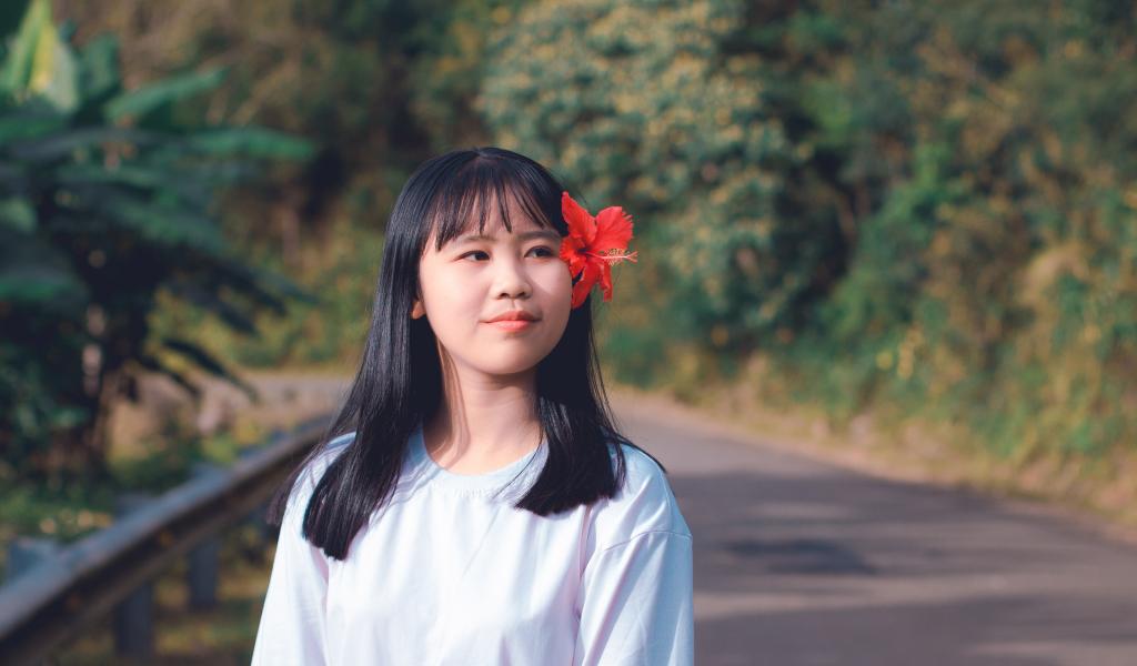 Wallpaper Asian girl with red hibiscus flower in her hair