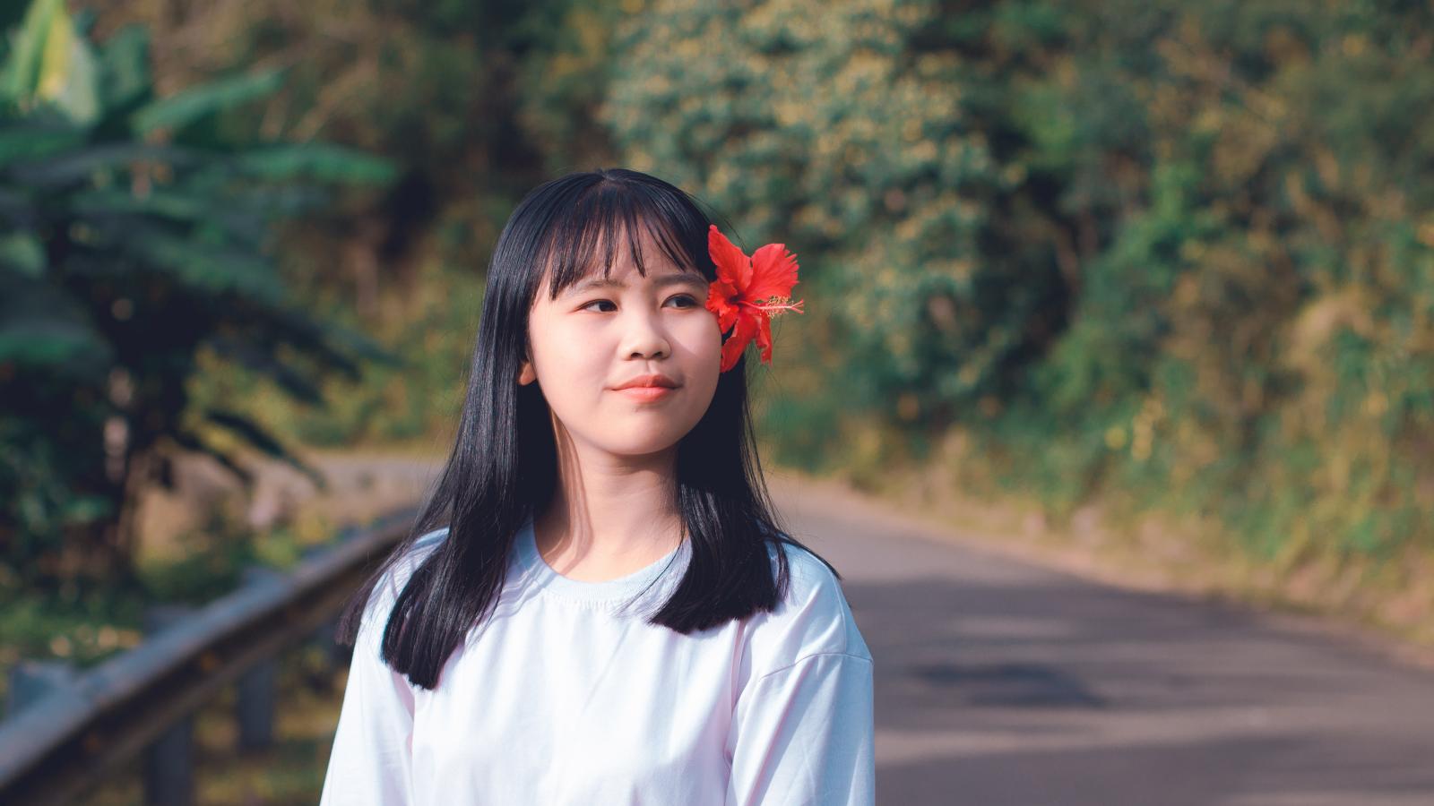 Wallpaper Asian girl with red hibiscus flower in her hair