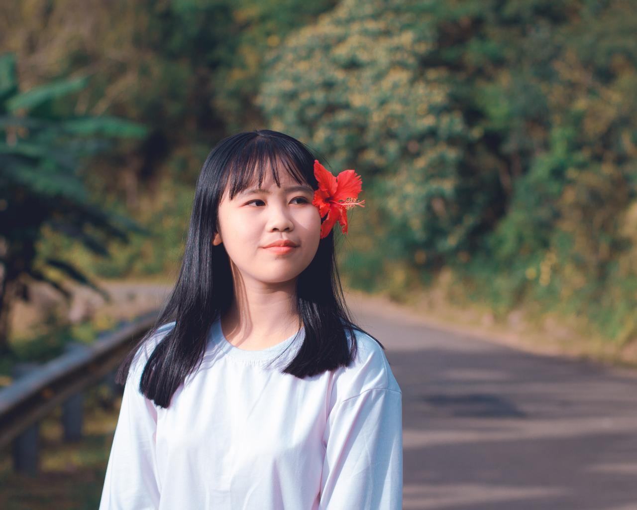 Wallpaper Asian girl with red hibiscus flower in her hair