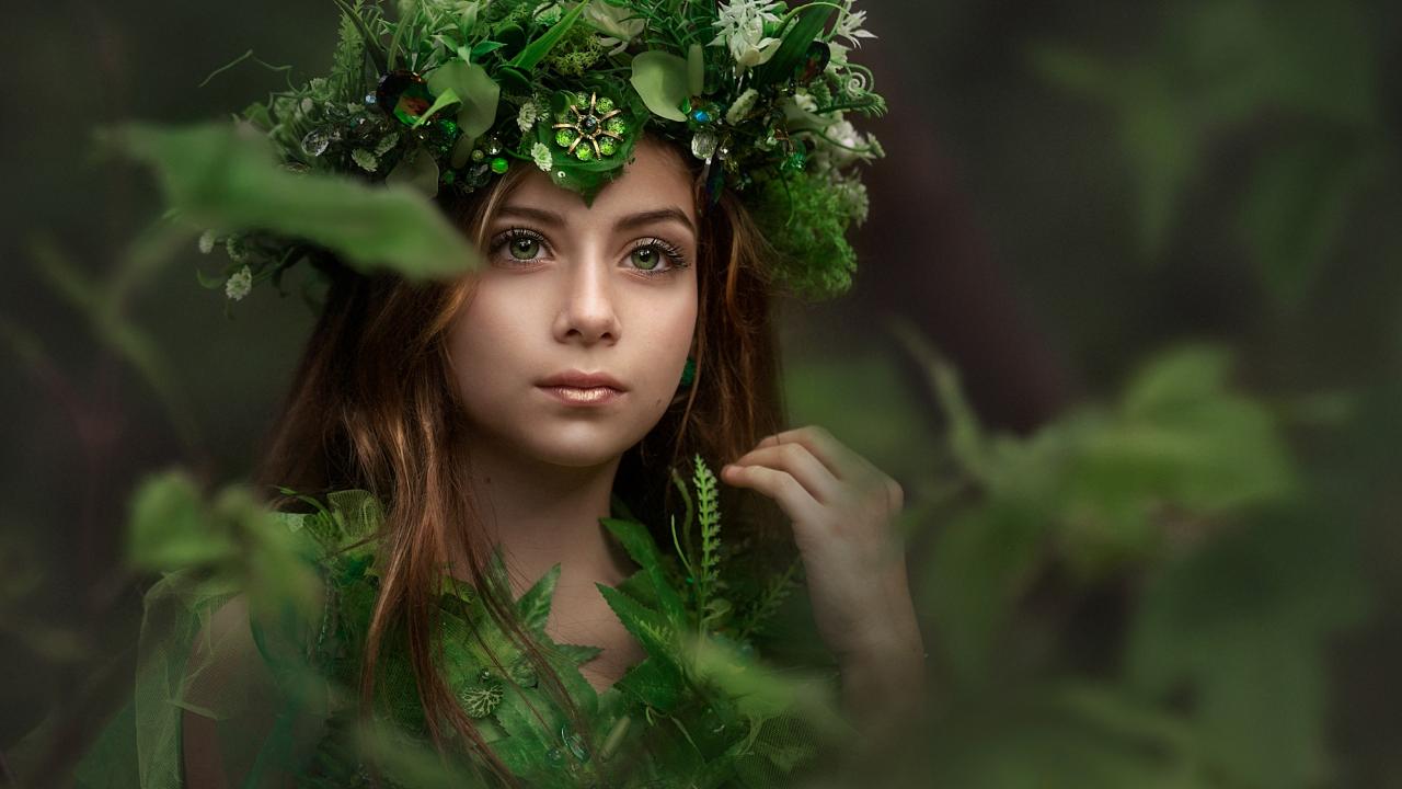 Wallpaper Beautiful blue-eyed girl with a wreath on the head of a tree