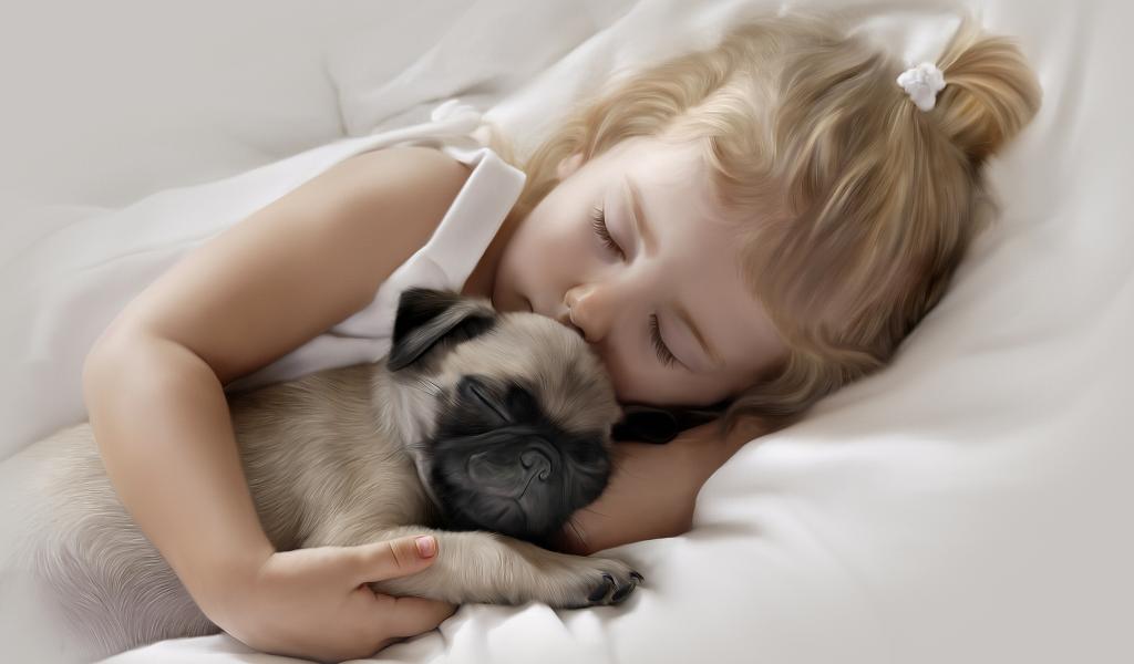 Wallpaper Little cute girl sleeping with pug puppy