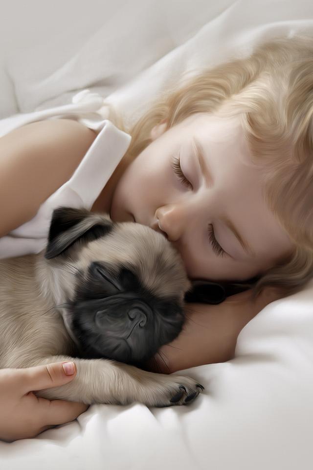 Wallpaper Little cute girl sleeping with pug puppy