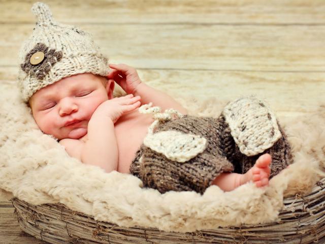 Wallpaper Little boy in a knitted hat is sleeping in a basket