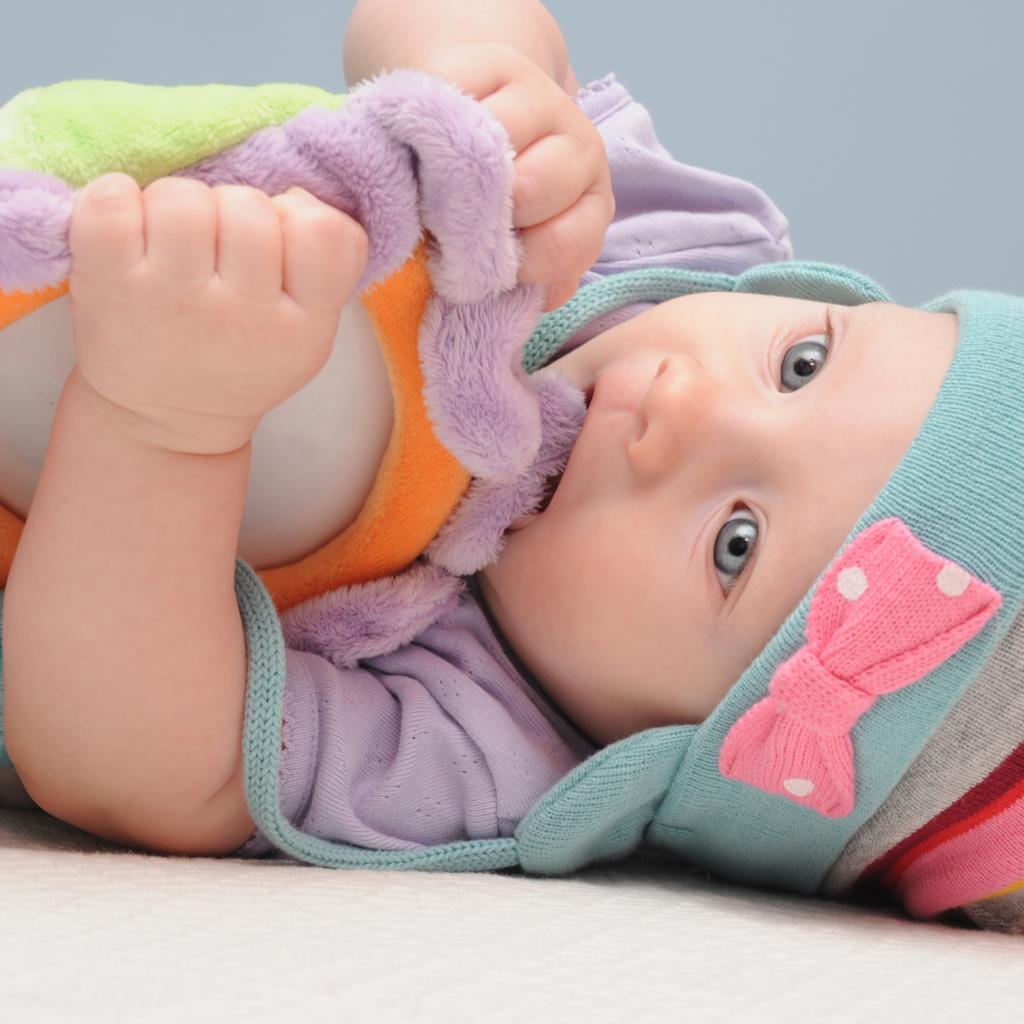 » Wallpaper A baby in a cap gnaws a soft toy