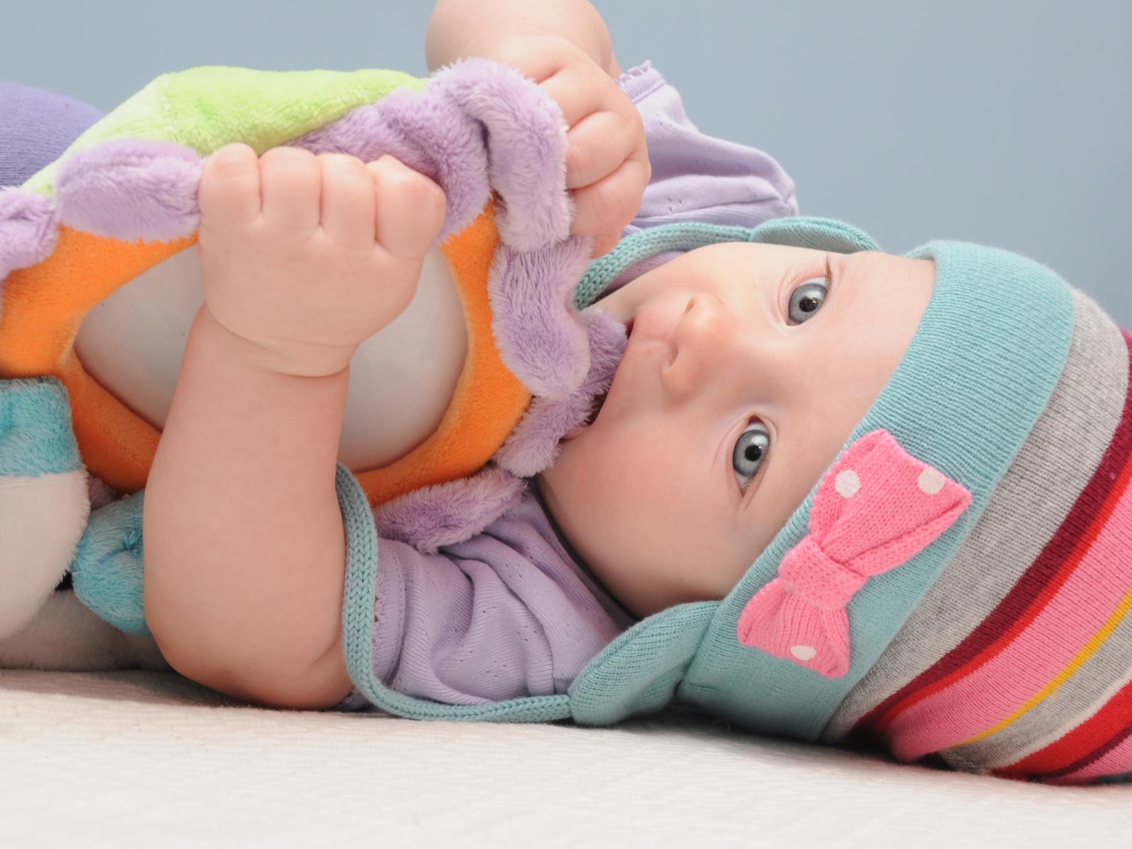 » Wallpaper A baby in a cap gnaws a soft toy