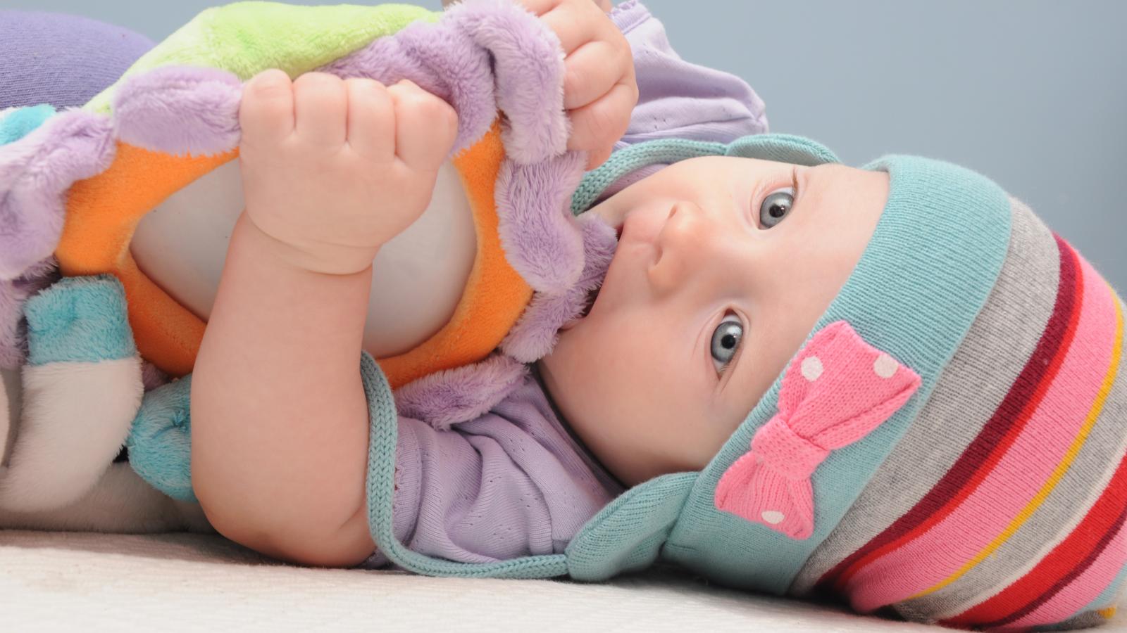 Wallpaper Blue-eyed baby with a soft toy on a gray background