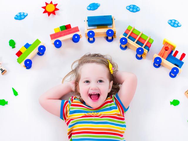 Wallpaper Little girl on a gray background with a toy train