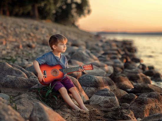 Wallpaper A little boy sits with a guitar on the rocks by the sea