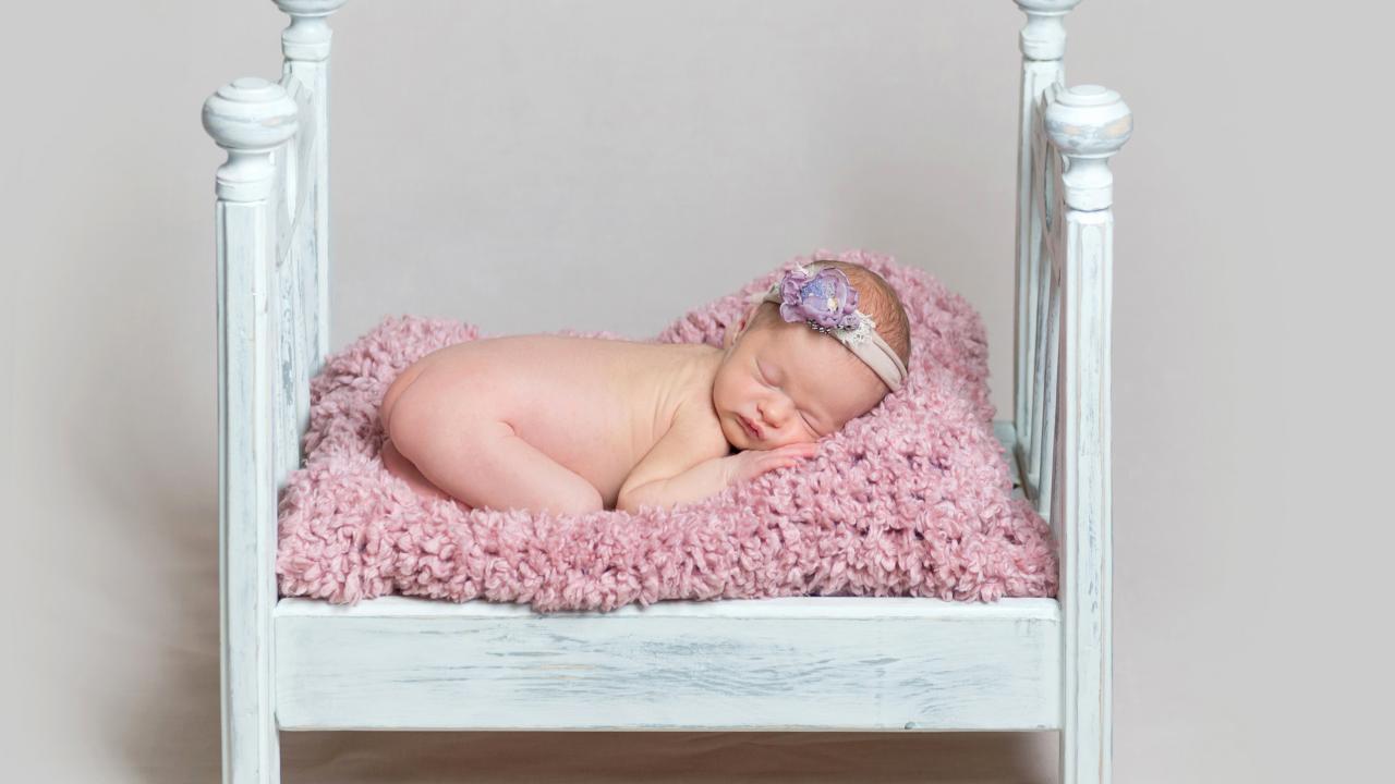 Wallpaper Cute baby sleeping in a little cot on a gray background
