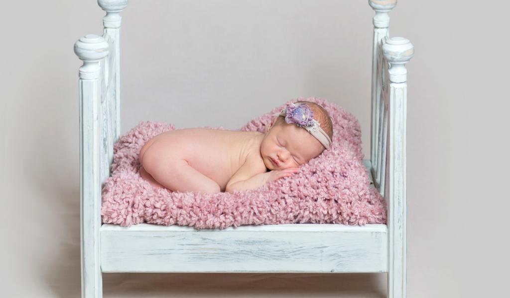 Wallpaper Cute baby sleeping in a little cot on a gray background