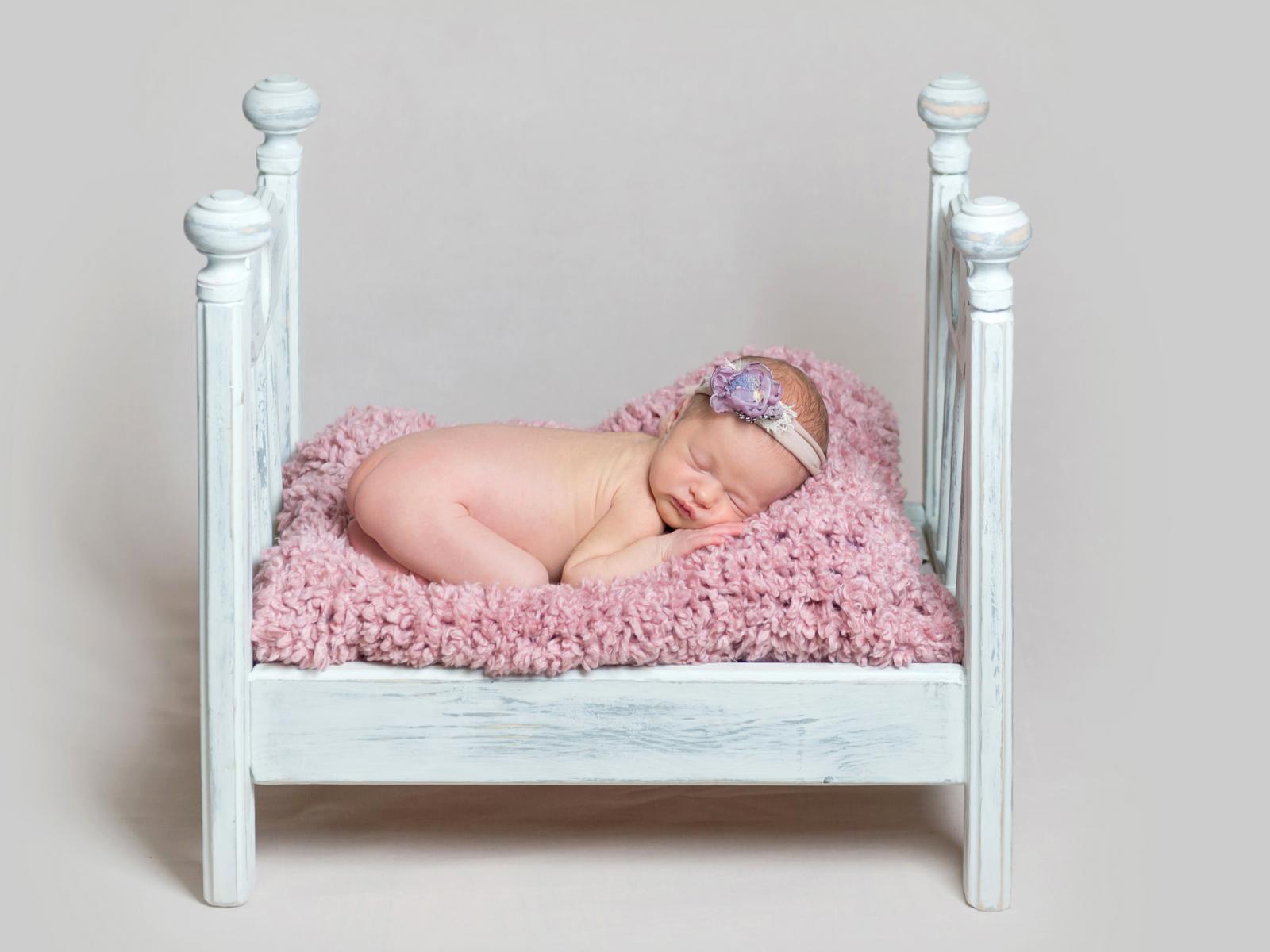 Wallpaper Cute baby sleeping in a little cot on a gray background