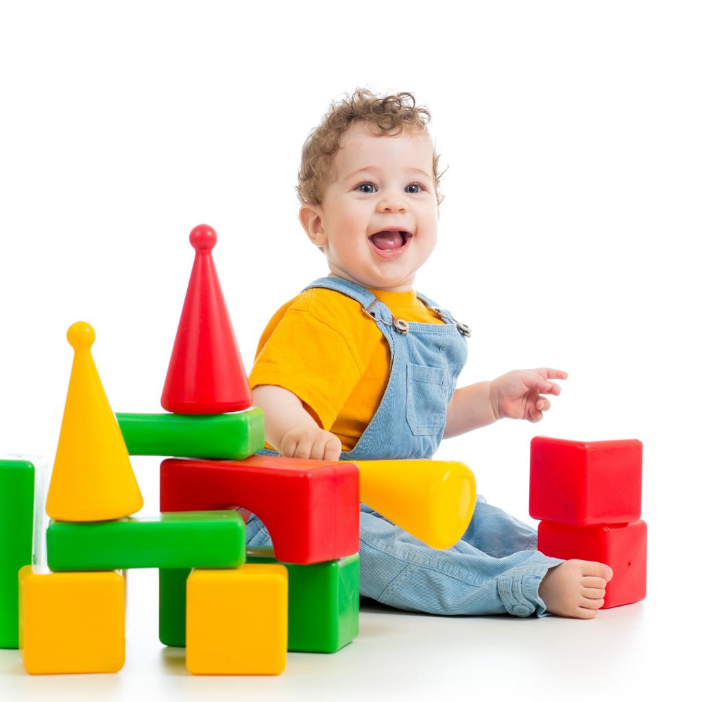 Wallpaper Smiling cute kid playing with cubes on white background