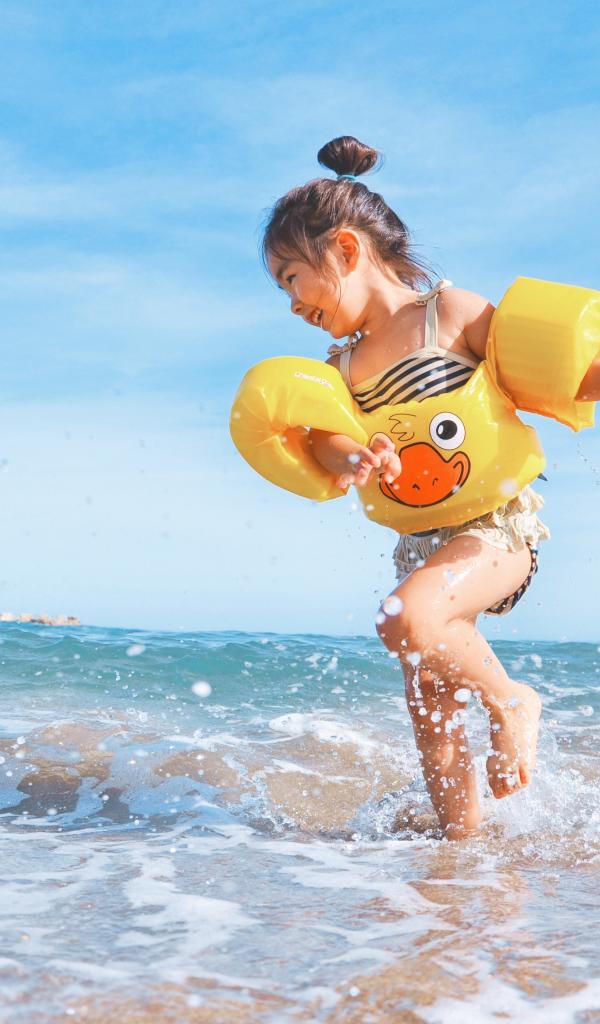 Wallpaper Little cheerful girl runs on the sea water