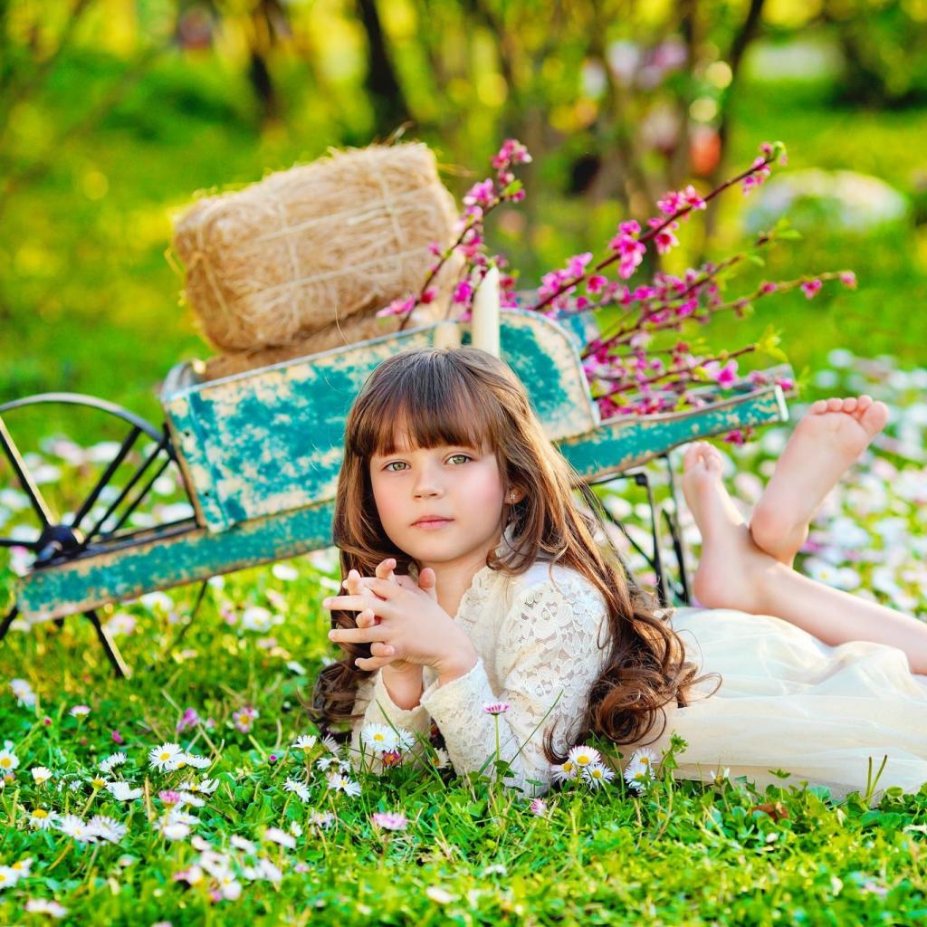 Wallpaper Cute little girl with a golden retriever puppy lying on green grass