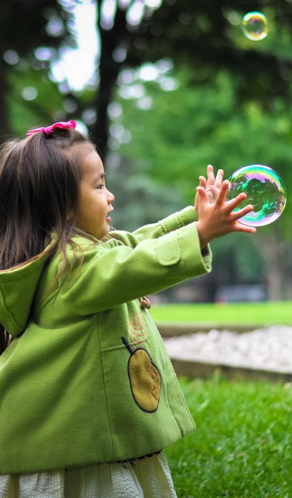 Wallpaper Little girl catches soap bubbles on green grass
