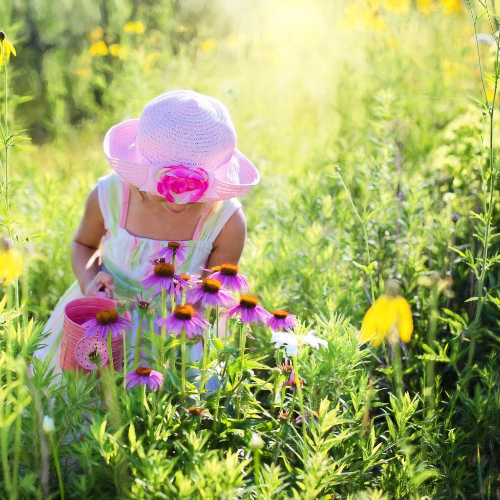 Wallpaper Little girl on a glade with pink flowers of Echinacea