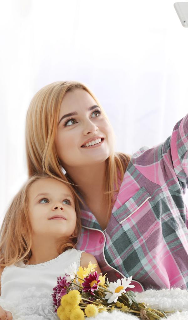 Wallpaper Little girl with mom make photo on smartphone