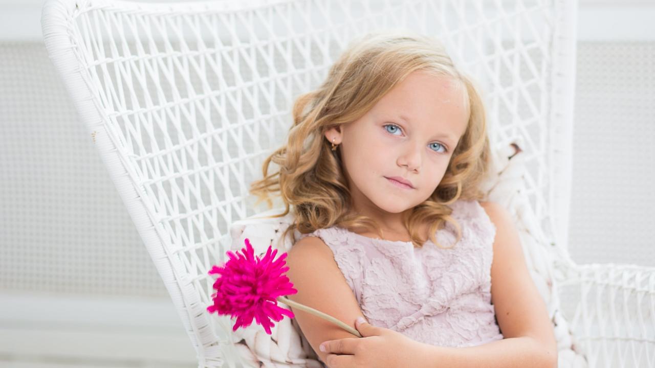 Wallpaper Little girl sitting in a white chair with a pink flower