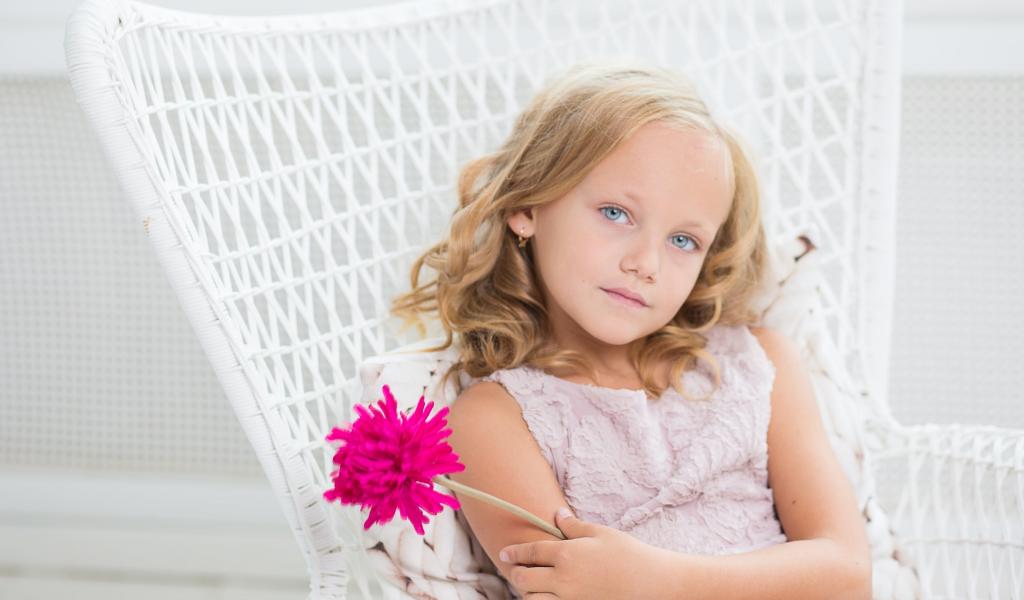 Wallpaper Little girl sitting in a white chair with a pink flower