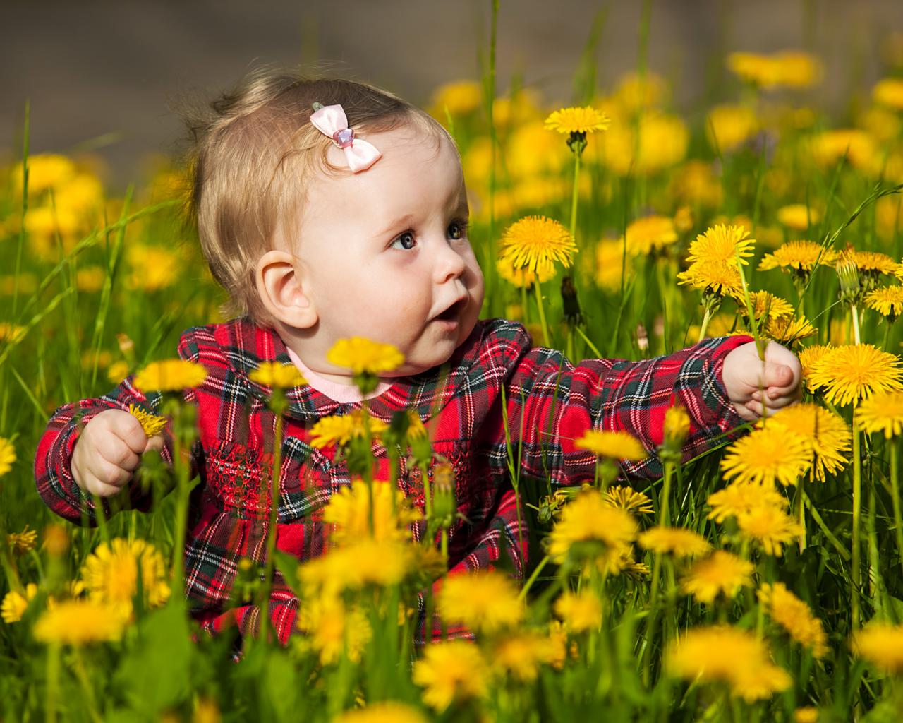 Wallpaper Little cute girl sitting in yellow dandelions