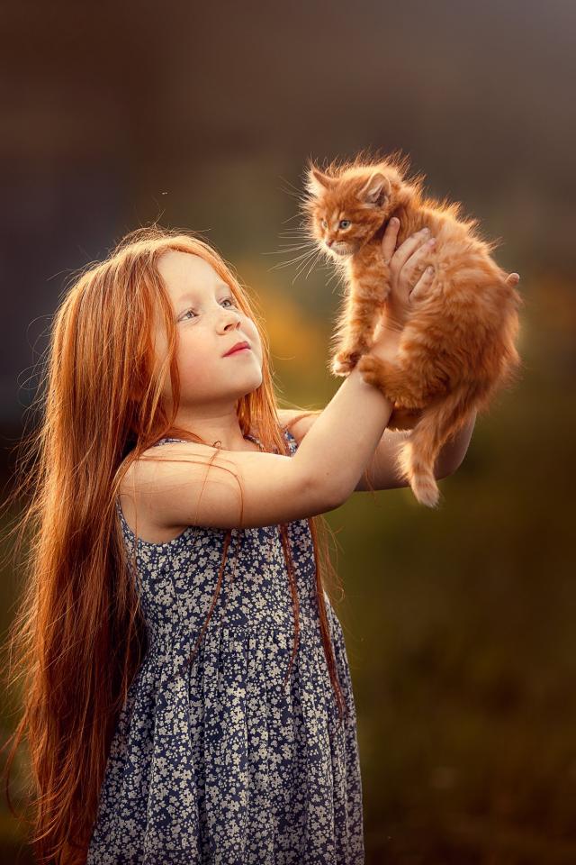 Wallpaper Little red-haired girl with a red kitten in their hands